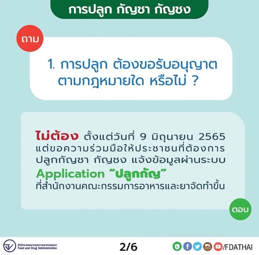 ตอบ : ไม่ต้อง ตั้งแต่วันที่ 9 มิถุนายน 2565 แต่ขอความร่วมมือให้ประชาชนที่ต้องการปลูกกัญชา กัญชง แจ้งข้อมูลผ่านระบบ Application "ปลูกกัญ" ที่สำนักงานคณะกรรมการอาหารและยาจัดทำขึ้น