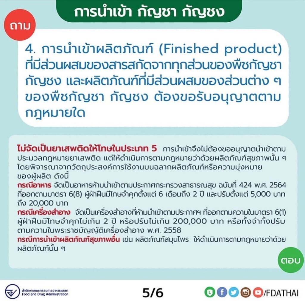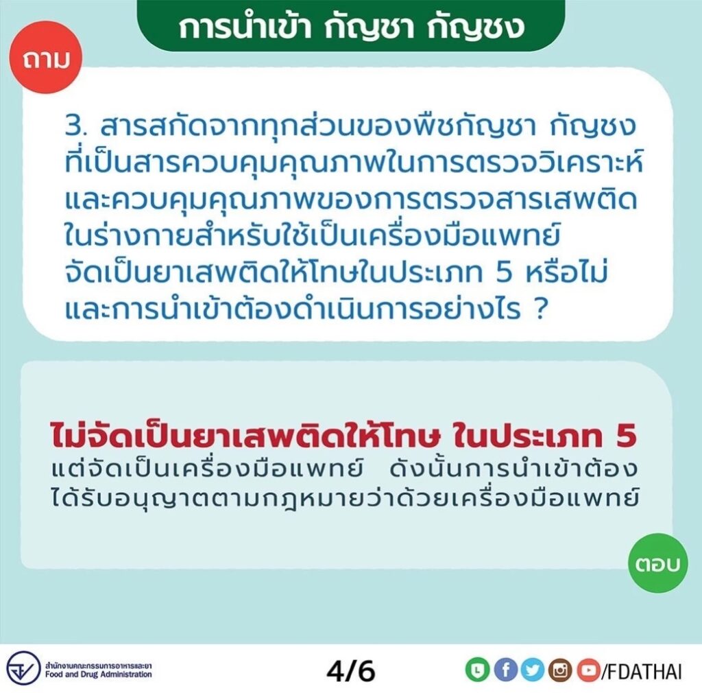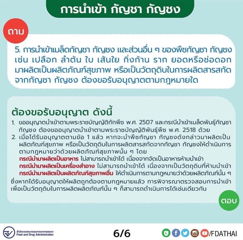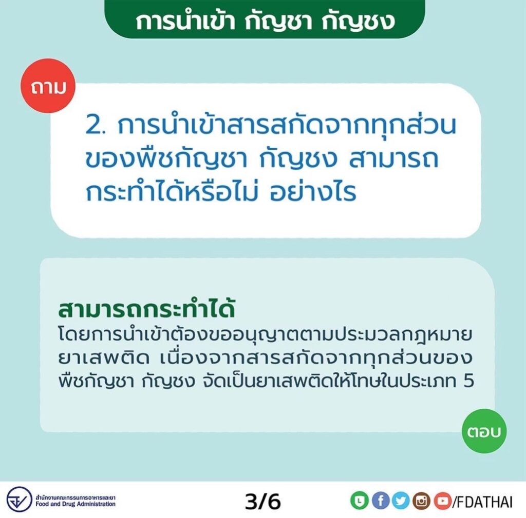 ตอบ : สามารถกระทำได้ โดยการนำเข้าต้องขออนุญาตตามประมวลกฎหมายยาเสพติด เนื่องจากสารสกัดจากทุกส่วนของพืชกัญชา กัญชง จัดเป็นยาเสพติดให้โทษในประเภท 5